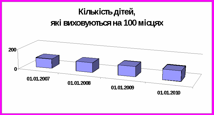 | | Сприяти забезпеченню в кожному ДНЗ наявності груп з різним режимом роботи відповідно до потреб населення | У більшості дошкільних навчальних закладів діє гнучкий режим роботи з метою урахування психофізіологічних відмінностей дітей та задоволення запитів батьків . В кожному закладі працюють чергові групи. Із загальної кількості груп за тривалістю роботи: 3 год - 1 група 6 год – 4 групи 9 год – 54 груп 10,5 год - 21 групи 12 год - 4 групи 24 год - 2 групи |