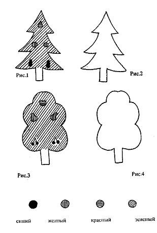 «Детям в детском саду дали задание: раскрасить деревце с разными плодами (предъявляются раскрашенный и контурный рисунки дерева (рис.3 и 4), но оказалось, что они еще не могут этого делать. Плоды они раскрашивать умеют, а само деревце им раскрасить трудно. Мы решили сделать так: деревце раскрашивают школьники, а плоды раскрашивают малыши. Поэтому ты должен раскрасить деревце зеленым цветом, а для игрушек оставить пустые места. Плоды потом нарисуют маленькие дети в детском саду».