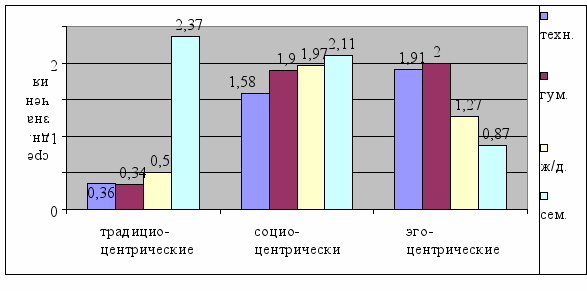 Наиболее значимо выражена традициоцентрическая установка у семинаристов – 2,37 балла (соответствует 2,37 предложениям в сочинении), это статистически выше, чем у всех других студентов (р≤0,01). В меньшей степени у семинаристов представлена социоцентрическая установка (2,11), и совсем мало представлена эгоцентрическая установка (0,87). Эгоцентрическая установка значимо более сильно выражена у студентов гуманитарных и технических специальностей по сравнению с железнодорожниками и семинаристами (р≤0,01).