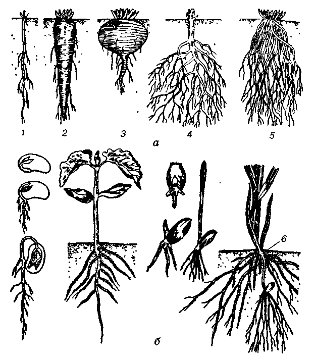 Мал. 1. Різні форми коренів (о) та їх розвиток (б) у квасолі (А) і пшениці (В):