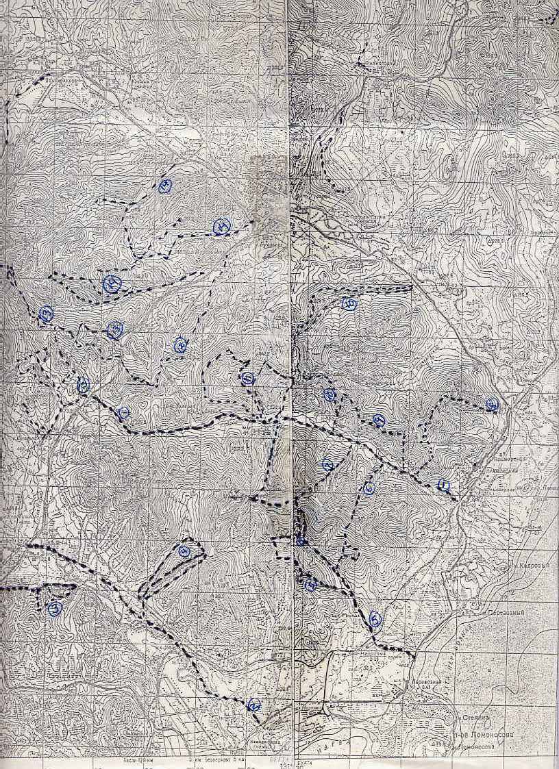 Рисунок № 1. Месторасположение маршрутов (черным цветом) проходившихся с октября 2006 по январь 2007 в Государственном биосферном заповеднике «Кедровая Падь» и на сопредельной территории.