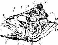 1 - лобная; 2- теменная; 3- верхнезатылочная; 4- носовая; 5 - предчелюстная; 6 - верхнече-люстная; 7- зубная; 8- суставная; 9 - предкрышка; 10- крышка; 11 - межкрышка- 12- подкрышка; 13- задневисочная; 14- предглазничная; 15- глазничные кости