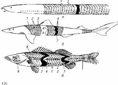 а- круглоротые; б - пластинчатожаберные; в -высшие костистые рыбы; I и 2 - миомеры; 3- миосепты; 4 - спинная мускулатура; 5- латеральная мускулатура; 6 и 7- мышечные конусы; 8 и 9-красные мышцы; 10- мускулатура хвостового плавника