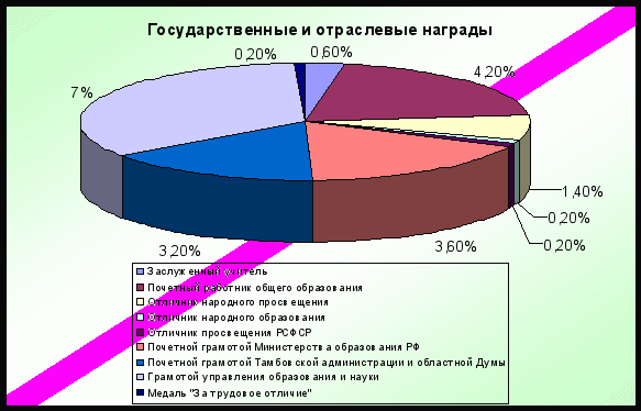 «Почетной грамотой Министерства образования РФ» награждены 18 (3,6%) педагогических работников; «Почетной грамотой Тамбовской администрации и областной Думы» - 16 человек (3,2 %); Грамотой управления образования - 36 человек (7 %); Медалью «За трудовое отличие» - 1 человек ( 0,2 %).