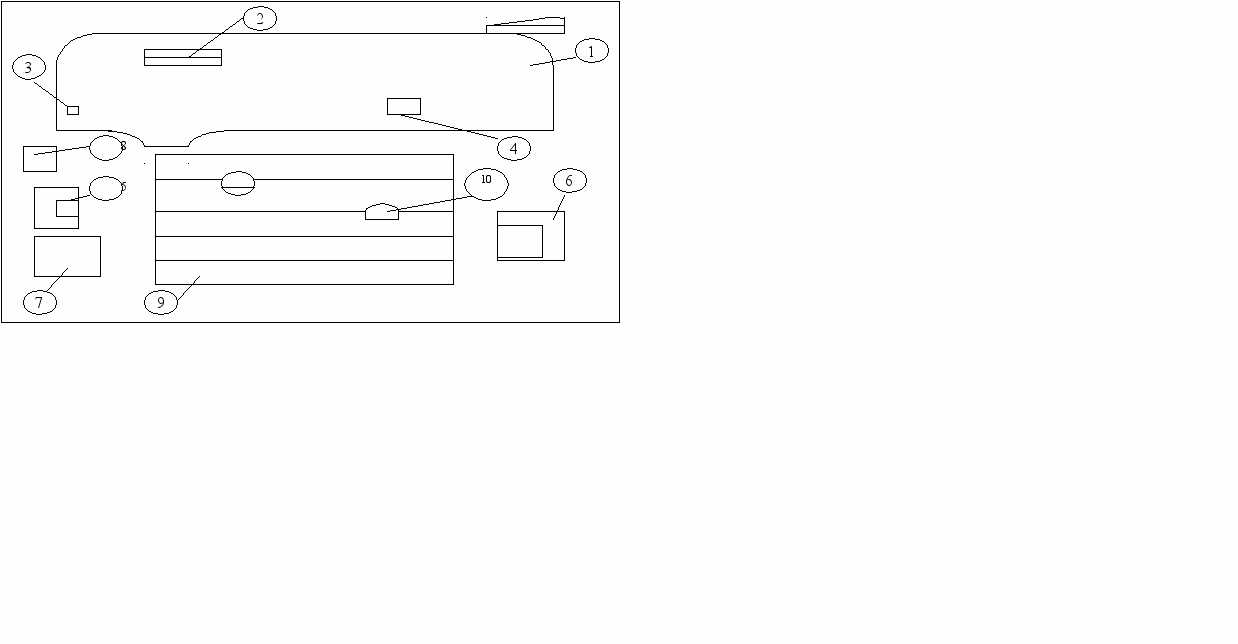 1 – станок; 2 – защитный экран; 3 – световая сигнализация; 4 – лоток для инструмента; 5 – тара для заготовок; 6 – тара для готовых деталей; 7 – инструментальная тумбочка (600х600х1100); 8 – урна для мусора; 9 – решетка под ноги (1800х500х40); 10 – поворотный стул.
