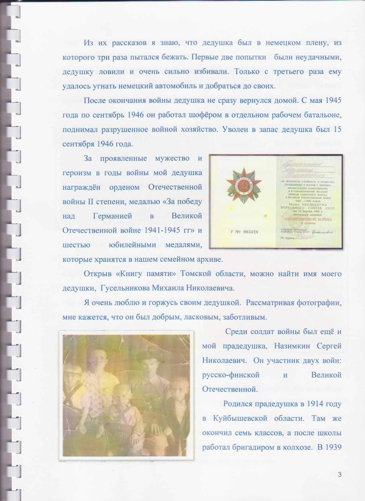 За проявленные мужество и героизм в годы войны мой дедушка награждён орденом Отечественной войны II степени, медалью «За победу над Германией в Великой Отечественной войне 1941-1945 гг» и шестью юбилейными медалями, которые хранятся в нашем семейном архиве.Открыв «Книгу памяти» Томской области, можно найти имя моего дедушки, Гусельникова Михаила Николаевича.