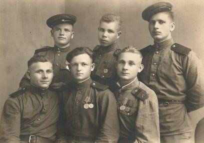 Он немного рассказывал о войне, а может мы не хотели слушать. Знаю только: прадедушка был дважды ранен и несколько раз контужен, попадал в окружение, не раз ходил в рукопашную, имел медали и ордена, командовал артиллерийским батальоном, закончил войну в Австрии, в Вене, и вернулся домой в 1945 году в звании старшего лейтенанта (на фото: прадедушка в центре, 1945 год)
