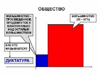 Итак, меньшинство – это продвинутое, просвещённое меньшинство, властвующее над отсталым большинством. Теперь мы спрашиваем спокойно это меньшинство и самих себя, а также всех, кого это интересует: "Как это называется? Вот это всё вместе – как называется? Когда есть просвещённое, продвинутое меньшинство, властвующее над отсталым и идиотическим большинством – как это называется?" Ась? Не слышу!