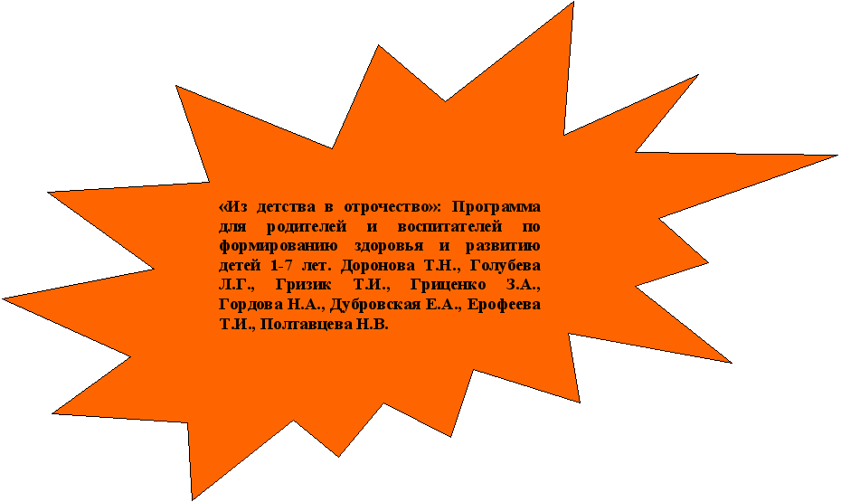 | Социально-личностное развитие | Комплексная программа: «Из детства в отрочество»: программа для родителей и воспитателей по формированию здоровья и развитию детей 1-7 лет. Доронова Т.Н., Голубева Л.Г., Галигузова Л.Н.. и др. М.: Просвещение, 2007 Экспериментальная программа: Примерная общеобразовательная программа воспитания, образования и развития детей старшего дошкольного возраста (Авторский коллектив: ДОронова Т.Н., Гризик Т.И., Ерофеева Т.А., Рунова М.А.) | Козлова С.А. Я – человек. Программа социального развития ребенка. – М.: Школьная пресса, 2003 |