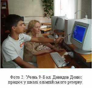 начну роль у розвитку зацікавленості учнів до інформатики відіграє робота з учнями в позаурочний час: на факультативних заняттях, підготовці учнів до конкурсу захисту наукових робіт Малої академії наук, школі олімпійського резерву. Найбільш хвилюючим періодом в житті ліцею є пора проведення предметних олімпіад та конкурсу-захисту наукових робіт МАН. Немає мешканця ліцею, котрий би не зупинився біля дошки об’яв з підсумками-вітаннями переможців з надією прочитати там своє прізвище (якщо учасник), чи знайомі прізвища однокласників, друзів. Особливо приємно вчителям бачити серед переможців імена своїх вихованців. Кожного року учні нашого ліцею активно беруть участь в предметних олімпіадах, конкурсах МАН, перемагають, досягають призових місць на всіх етапах їх проведення. Імена переможців з усіх предметів можна побачити на сайті ліцею ссылка скрыта за кожен рік, починаючи з 2004 – 2005 н.р. Ці учні є гордістю ліцею. Особливих успіхів в олімпіаді з інформатики досягли учні в 2004-2005 н.р.: Райчук Антон, Литвиненко Ігор, Бедратюк Степан. Вони стали переможцями обласної олімпіади і учасниками Всеукраїнської олімпіади, а Райчук Антон - став переможцем і нагороджений дипломом ІІ ступеню (в даний час - це студенти Київського національного університету ім. Т. Г. Шевченка). У 2005-2006 н.р. Чернігов Олександр досяг ІІ місця у міській олімпіаді з інформатики. У 2006-2007 н.р. учень 9 класу фізико-математичного профілю Давидов Денис – вперше брав участь і нагороджений дипломом ІІ ступеню у міській олімпіаді. Але є надія, що наші учні продовжать традицію бути в перших рядах переможців олімпіади з інформатики.Свої досягнення в галузі програмування щорічно представляють учні на конкурсах: конкурсі захисту наукових робіт МАН, конкурсі “Юного програміста”. Особливо запам’яталися роботи учнів “Все про всесвіт” Литвиненка Ігоря, “Феномен НЛО” Іваннікова Костянтина, “Наша галактика” Галаса Олексія (2003-2004 н.р.), “Передавання конфіденційної інформації” Литвиненка Ігоря (2004-2005 н.р.) – учасник Всеукраїнського конкурсу, “Можливості графічних редакторів” Паригіна Євгена (2005-2006 н.р.).