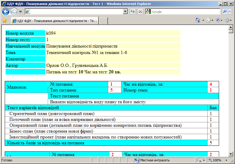 1) Автор готовит тест, в очень простой для него и понятной форме – обычная простейшая табличка в Word-e. Можно готовить в формате RTF, в любом текстовом редакторе – на данном этапе это не принципиально. Автор не изучает экзотических систем ввода данных, не морочит себе голову запуском хитрых «скриптов». Автор является специалистом в своей области, и от него требуется только знание на начальном уровне любого текстового редактора.