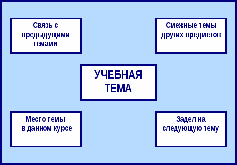 екомендуется при подготовке материала для проведения занятий в качестве структурной единицы рассматривать не один урок, взятый изолированно, а учебную тему (состоящую, из нескольких уроков). Если учитель обращается к ИК-технологиям для использования соответствующих материалов для проведения ОДНОГО урока, то следует иметь в виду, что это во многом напрасная трата сил и ресурсов учителя. Ведь может оказаться, что материалы, близкие по теме, но «выпадающие» из рамок данного урока, будут оставлены невостребованными. Такой урок будет выпадать из общего стиля. Только одна часть учебной темы будет проработана на высоком уровне. Соответственно, будут смещены акценты при изучении учебной темы, и будут сформированы неверные представления. Существует мнение о том, что для более результативного обучения следует подбирать и структурировать материал для всей учебной темы и нельзя ограничиваться темой одного урока. Показано, что блок «Учебная тема» следует «снабдить контактами», условно представленными в виде блоков на рисунке. Эти блоки нашли отражение выше в виде дидактических задач: