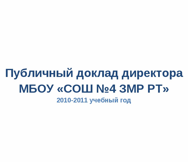 В своей деятельности МБОУ «СОШ № 4 ЗМР РТ» в 2010/2011 учебном году руководствовалось законом Российской Федерации «Об образовании», целевой программой «Стратегия развитие образования в Республике Татарстан на 2010-2015 годы», Программой развития МБОУ «СОШ №4 ЗМР РТ».