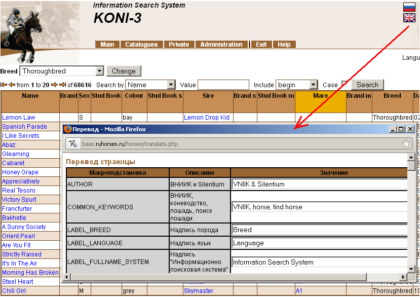 Коневодство – это еще и международный процесс. Лошадей периодически экспортируют в другие страны, завозят новых для улучшения породы внутри страны. Поэтому необходимо иметь информацию как минимум на английском языке. Потому обеспечена двуязычность каждой таблицы и создан интерфейс портала с возможностью переключения на разные языки. При этом переводчик в специальном режиме осуществляет перевод для каждой страницы. Если какие-то элементы присутствую на нескольких страницах, то их достаточно перевести один раз. Архитектурно количество иностранных языков для web-интерфейса неограниченно.