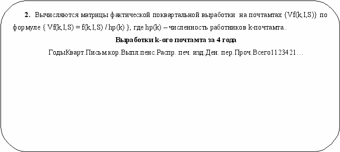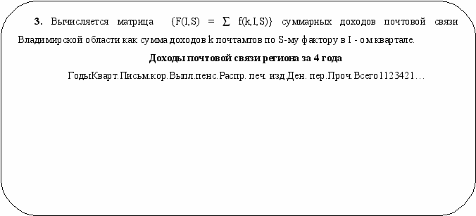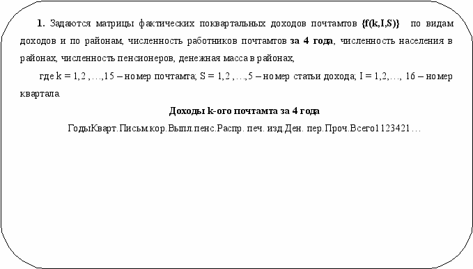 Задача планирования доходов формулируется следующим образом: необходимо рассчитать плановые задания доходов для почтамтов на год вперед поквартально и по отдельным видам доходов с учетом влияющих на них социально-экономических факторов.