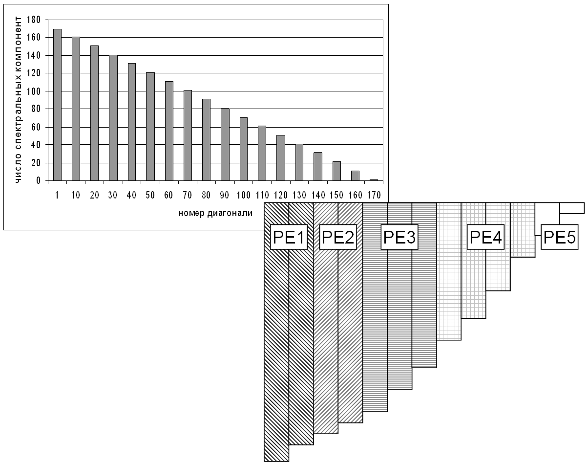 В спектральном пространстве была использована также одномерная декомпозиция, но по спектральным числам. Т.к. в модели используется треугольное усечение спектральных рядов, то объемы вычислений, производимых для различных спектральных компонентов, оказываются различными. Поэтому приходится перераспределять загрузку процессоров для достижения баланса. Декомпозиция, использованная в пространстве спектральных коэффициентов, представлена на рисунке 1.1.б.