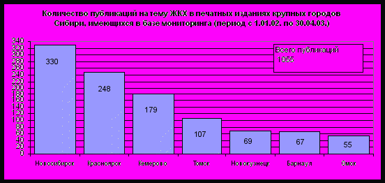 В общественном фонде «Фонд развития местного самоуправления» при Ассоциации сибирских и дальневосточных городов осуществляется тематический мониторинг СМИ городов сибирского региона. Материалы мониторинга по теме ЖКХ печатных изданий 7 сибирских городов: Новосибирска, Красноярска, Барнаула, Омска, Томска, Кемерово, Новокузнецка за период с 1.01.2002 по 30.04.2003 гг. послужили основой для анализа освещения вопросов жилищно-коммунального хозяйства в региональной прессе.