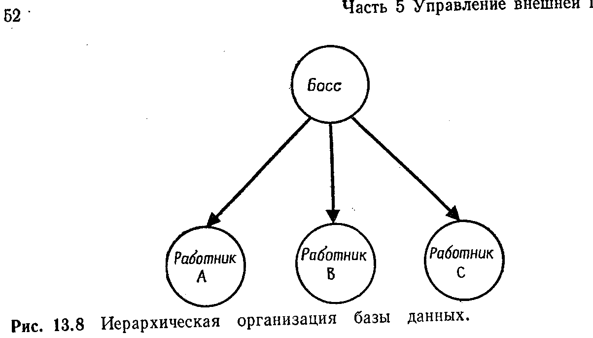 енность метода баз данных определяется преимущественно тем, что он позволяет явным образом указывать отношения между элементами данных. В иерархической модели (рис. 13.8) элементы данных связываются отношением «отец—сын»; каждый отец может иметь много сыновей, однако каждый сын может иметь только одного отца. Иерархическая организация не предусматривает выражения отношений, в которых сыновья связываются более чем с одним отцом. Такая негибкость заставляет многих разработчиков выбирать другую модель базы данных. Если, однако, отношения между данными в действительности являются иерархическими, то иерархическая модель вполне приемлема, так как ее легко реализовать, модифицировать и производить в ней поиск нужных данных.