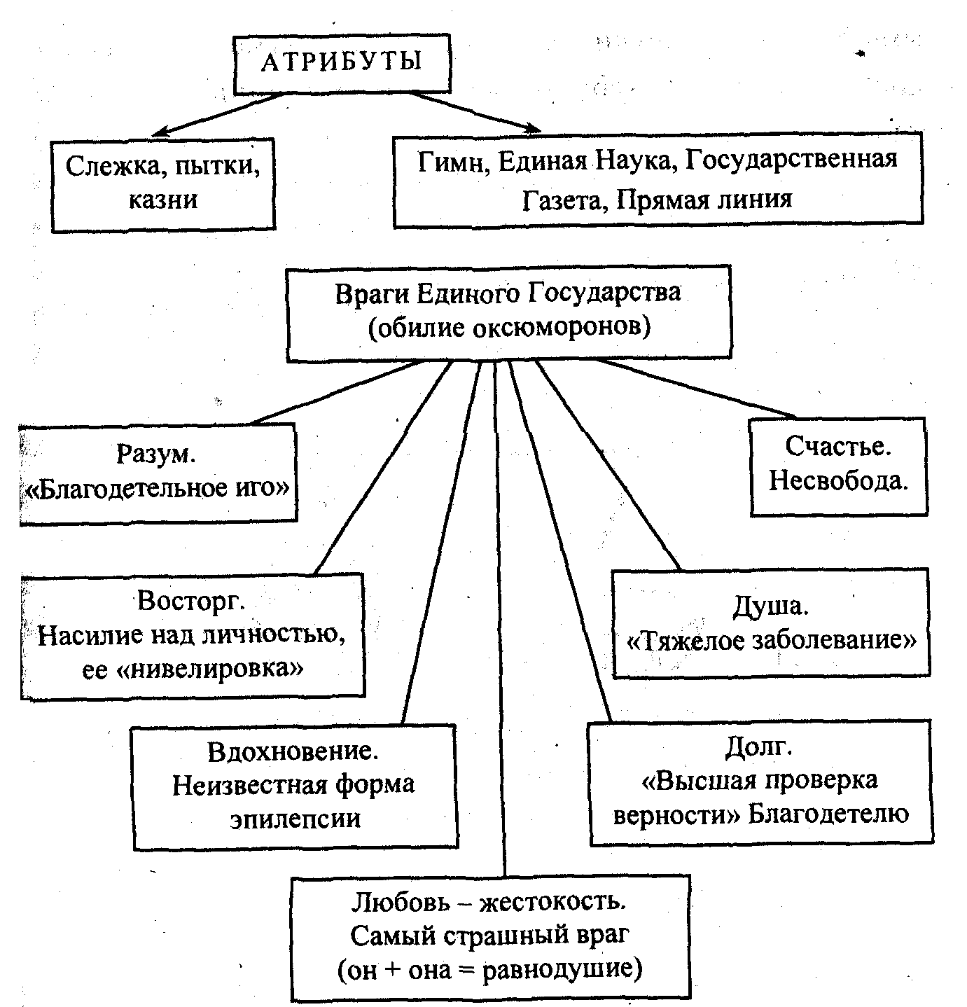 Автор создал гротескную модель Государства, в котором идея равенства обернулась всеобщей уравниловкой. Благополучная жизнь построена «именно на отказе от собственной личности». В романе нет «я», существует только «мы». Но человеческая природа не выносит безличного существования.