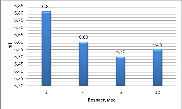 Для характеристики качества мяса весьма важным показателем является величина рН, позволяющая оценить его свойства и предопределить направление дальнейшей переработки. Непосредственно после убоя баранина овец бакурской породы имеет высокие значения показателя рН (6,81-6,55) (рис.3), что ограничивает ее использование для производства сырокопченых и сыровяленых колбас.