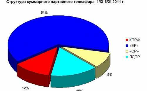 По данным мониторинга телеэфира, который проводит КПРФ34, всего за период с начала выборной кампании – с 1 сентября по 6 ноября 2011 года – распределение эфирного времени на пяти федеральных телеканалах («Первый», «Россия», НТВ, ТВЦ и Рен-ТВ) выглядело следующим образом35: