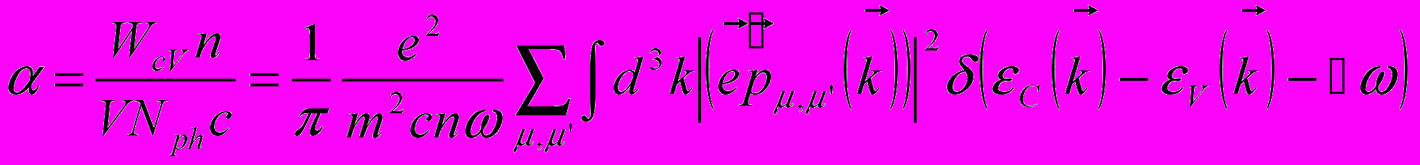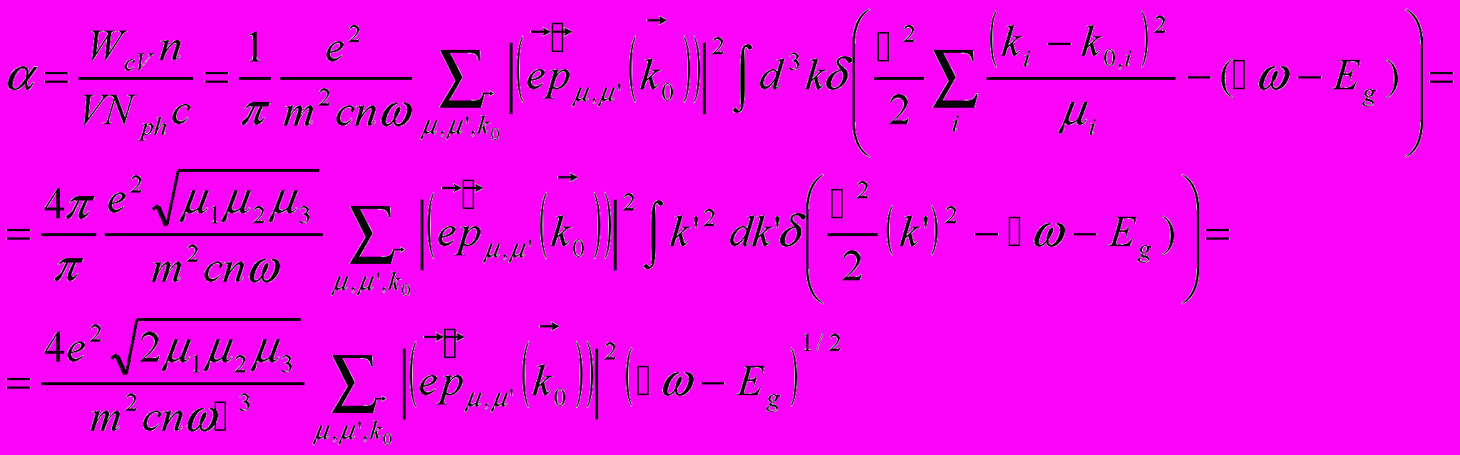 . Интересно отметить, что , как Вы наверное помните, этот же матричный элемент в рамках модели Кейна определяет массу электрона и легкой дырки. Зная эти массы можно оценить и матричный элемент оптического перехода. Теперь, когда матричный элемент перехода худо бедно определен, можно продвинуться дальше в вычислениях коэффициента поглощения или что тоже само (с точностью до коэффициента) вероятности оптического перехода.