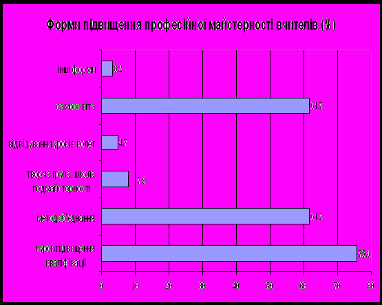 Серед колективних форм методичної роботи найбільш поширеним серед вчителів залишається районне методичне об’єднання. Беручи участь у роботі шкільних, районних методоб’єднань, підвищують свою професійність 61,7% опитаних вчителів. Не надто популярними формами групової методичної роботи є творчі групи, школи педагогічної майстерності (7,9%). Серед інших форм підвищення рівня професійної майстерності було названо школу молодого вчителя, школу перспективного педагогічного досвіду, участь у конкурсі «Вчитель року» (загалом 3,2%)