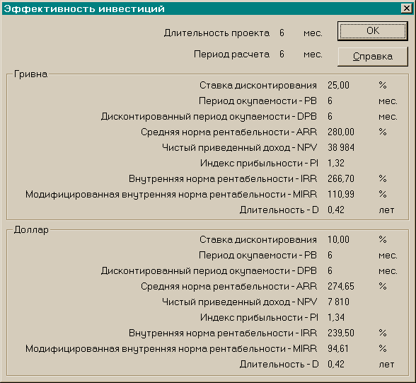 Отримані для даного інвестиційного проекту показники ефективності інвестицій (для розрахункового періоду 36 місяців) показані на рис. 4.8. Ці показники свідчать про високу економічну привабливість цього проекту.