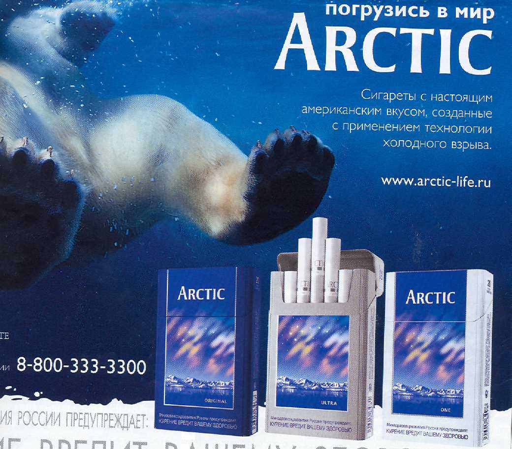 А вот сужение поле бренда явно не играет на руку производителю. Это можно увидеть на примере описанной выше марки Арктика. Пачка сигарет, замерзшая в глыбе льда, вовсе не создаёт ощущения Арктики.