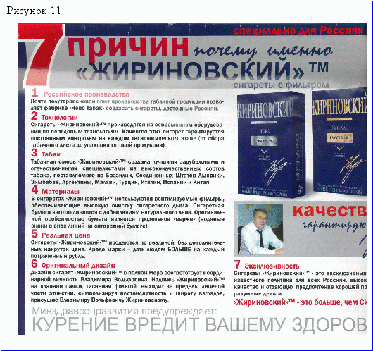 Ярким прмером удачного кобрендинга со знаменитостью является недавно выпущенная на рынок марка «Жириновский» (Рис. 11), результаты продаж которой уже в первые месяцы превзошли самые оптимистичные прогнозы производителя «Нево Табак». Надпись «Жириновский» на клапане пачки выходит за пределы лицевой части этикетки, «символизируя нестандартность и неординарность, умение увидеть большее, присущее В.В.Жириновскому».