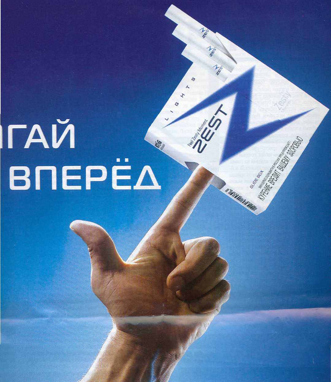 чень удачным является и слоган марки “Zest” “Feel zesty moment”(Рис.3), который приводится и в русской интерпретации на рекламных плакатах («Двигай вперед»). Данный слоган можно прочесть буквально (необычный способ открытия пачки) и как жизненный принцып.