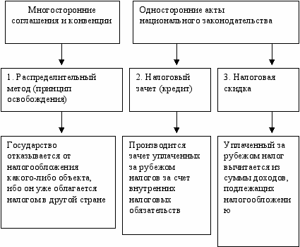Применяют как односторонние меры устранения международного двойного налогообложения, связанные с нормами внутреннего налогового законодательства, так и многосторонние меры, реализуемые с помощью соответствующих международных соглашений и конвенций.