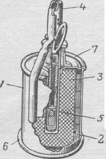 / — корпус; 2 — металлическая лента, 3 — разрывной заряд; 4 — запал, 5 — трубка с фланцем. 6 — дно, 7 — крышка