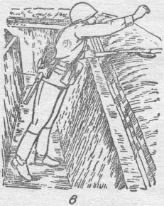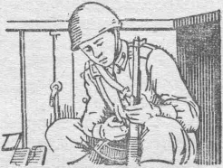 10. Перед метанием гранаты. Достать гранату из сумки, вывинтить пробку из трубки, на ее место ввернуть до отказа запал. Части ударного механизма запала находятся в следующем положении: ударник взведен и удерживается в верхнем положении вилкой спускового рычага, соединенного с трубкой ударного механизма предохранительной чекой. Концы предохранительной чеки разведены и прочно удерживают ее в запале.