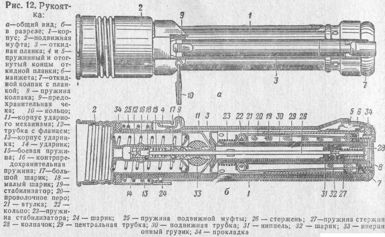 Устройство запала, работа частей и механизмов гранаты изложены в ст. 8—11.