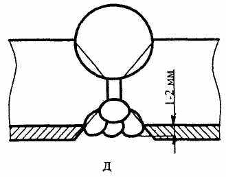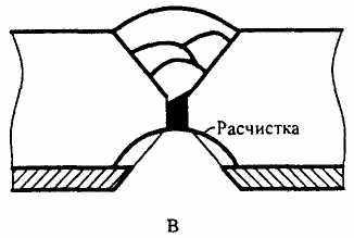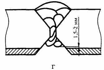 г) выполнение корневого шва (и заполнение разделки основного слоя) со стороны плакировки, не доходя до плакирующего слоя на 1.5-2 мм;