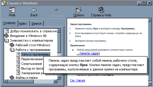 У підвікні Содержание довідкова інформація представлена у вигляді ієрархічної структури розділів. Усередині розділу містяться підрозділи або окремі статті. Розділ розкривається натиском на його назві вказівником мишки. При натиску на назві статті, праворуч у вікні з’являється її вміст. Статті можуть використовувати перехресні посилання у вигляді виокремленого підкресленого тексту. При натиску на посиланні відбувається перехід до іншої статті.