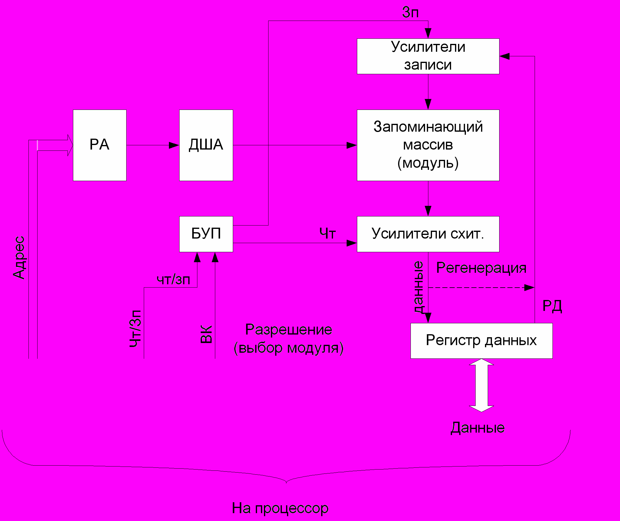 Адресная часть с процессора сначала поступает на регистр адреса (РА), а с него- на дешифратор адреса ДшА, который выбирает строку запоминающего массива (номер ячейки памяти). По сигналу запись (Зп) производится запись данных в заданную ячейку памяти.