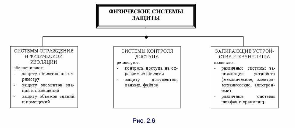 • физические средства, включающие различные средства и сооружения, препятствующие физическому проникновению (или доступу) злоумышленников на объекты защиты и к материальным носителям конфиденциальной информации (рис. 2.5) и осуществляющие защиту персонала, материальных средств и финансов и информации от противоправных воздействий;