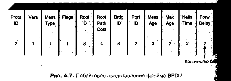 - Forw Delay – задержка пересылки, содержащая интервал времени, которое должно пройти перед тем, как мосты перейдут в новое состояние после изменения топологии (сообщения об изменениях топологии содержат только четыре байта: поле идентификатора протокола, содержащее 0; поле версии, содержащее 0, и поле типа сообщения, содержащее значение 128).