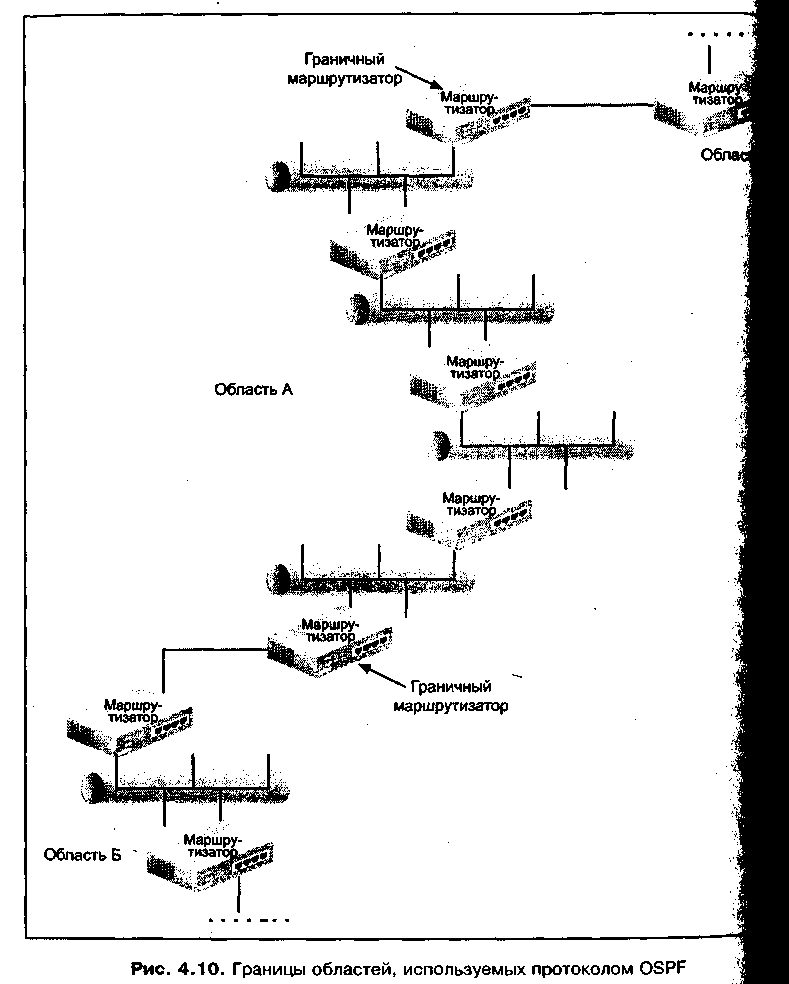 Протокол Open Shortest Path First (OSPF) применяется чаще всего, он имеет несколько преимуществ по сравнению с протоколом RIP. Одним из достоинств является то, что при его использовании маршрутизатор пересылает только ту часть таблицы маршрутизации, которая относится к его ближайшим каналам; такая посылка называется "сообщением маршрутизатора о состоянии каналов". Ближайшие каналы маршрутизатора определяются путем установки граничных маршрутизаторов, или маршрутизаторов границы области, на концах сети. Все маршрутизаторы, находящиеся между ними, обращаются к общей таблице маршрутизации по протоколу OSPF (рис. 4.10).