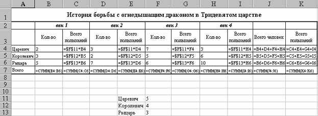 Решение. Прежде всего необходимо продумать структуру таблицы и разместить в ней имеющуюся информацию. В приведенном ниже решении информация о царевичах, королевичах и рыцарях занесена в строки, а столбцы содержат сведения о сражениях по векам. Нижняя строка и последние два столбца содержат итоговую информацию согласно условию задачи. Информация о полыханиях, приходящимся на одного царевича, королевича, рыцаря, вынесена отдельно. Это связано с тем, что при изменении этих данных достаточно будет изменить их в указанных ячейках, не изменяя при этом всех формул.