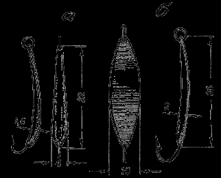 «Поперечная» блесна (рис. 26, а). изготовляется из белого металла, меди или латуни в форме удлинённой пластинки с утолщением к более широкой стороне. Медная или латунная — серебрятся. В узком конце пластинки впаяны два одинарных крючка № 16, в более широком — один крючок того же размера. У края, по центру тяжести при продольном положении пластинки, просверлено отверстие, в которое пропущено колечко для прикрепления блесны к лесе. Каждый крючок замаскирован красным шерстяным пушком. При погружении в воду блесна идёт утолщённым концом вниз, при остановке занимает горизонтальное положение, качаясь наподобие коромысла. Нижняя свободная часть её делается несколько тоньше верхней.
