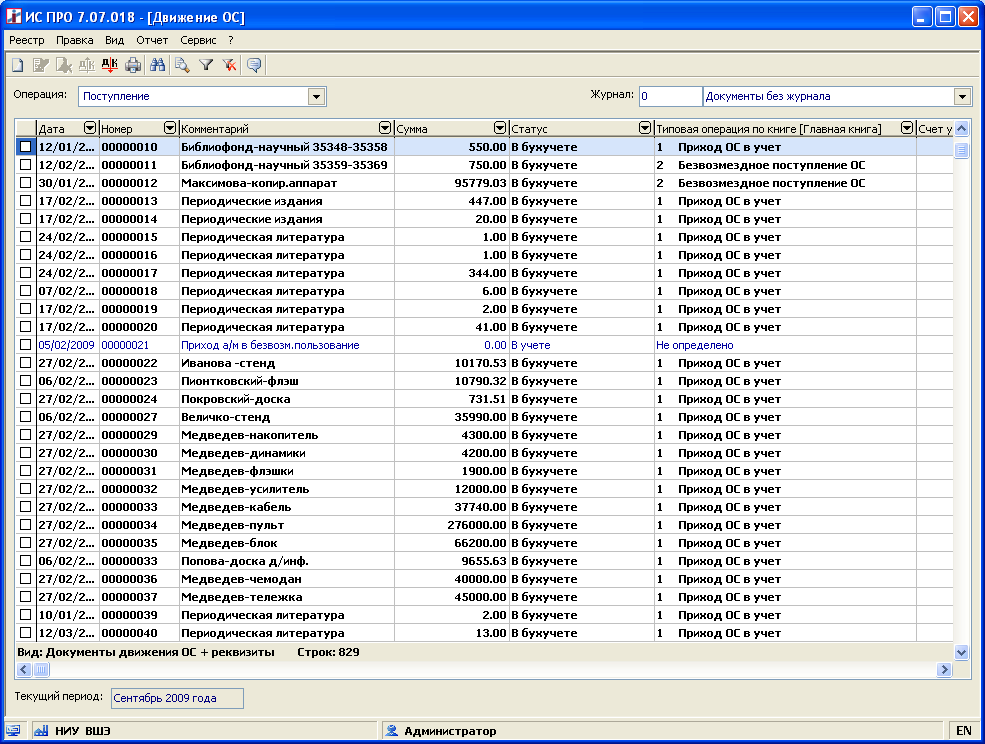 В ГУ-ВШЭ приняты следующие основные операции в учете ОС