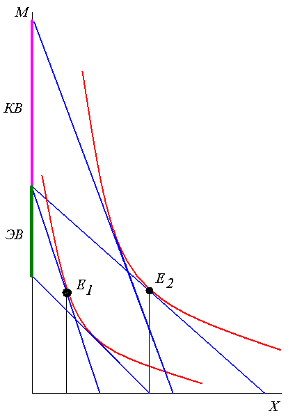 Излишек 1. Эквивалентная вариация: «мы спрашиваем, что такое "потеря дохода", которая компенсировала бы воздействие цены, оставляя благосостояние потребителя тем же, что и прежде». (Вехи, 1, с. 194)
