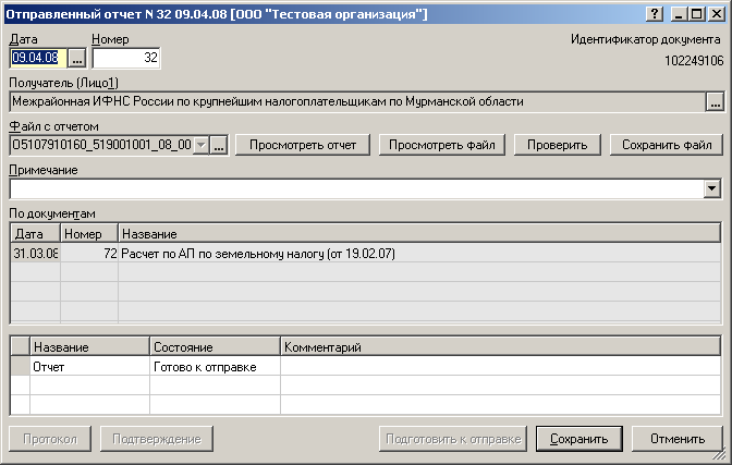 - После создания отчета необходимо нажать на строку «Передать на подпись» в верхней части окна (см. рис. 2). Если ошибок в отчете не обнаружено, то на экране (см. рис. 8) в строке с названием отчета, в нашем случае «Расчет по АП по ЕСН», появится признак «Готов к отправке». Если же в отчете обнаружены ошибки, то программа выдаст сообщение (см. рис. 9), и на экране появится окно «Протокол проверки» (см. рис. 10), в котором в нижней части будет приведен перечень ошибок. Эти ошибки необходимо исправить и повторить процесс отправки отчетности.