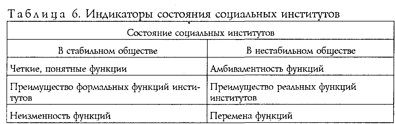 Состояние институтов является индикатором (значимым показателем) социальной стабильности всей общественной системы: общество стабильно тогда, когда функции институтов понятны, очевидны, неизменны (табл. 6).