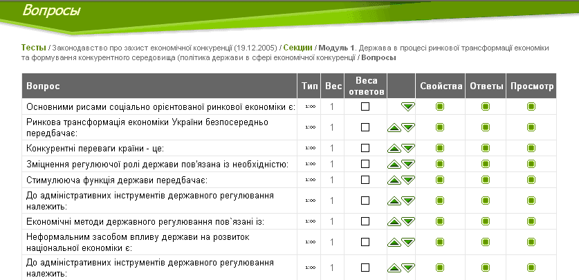Уведені питання по кожній секції відображаються у вікні “Вопросы”, як це показано на Рис. 7: