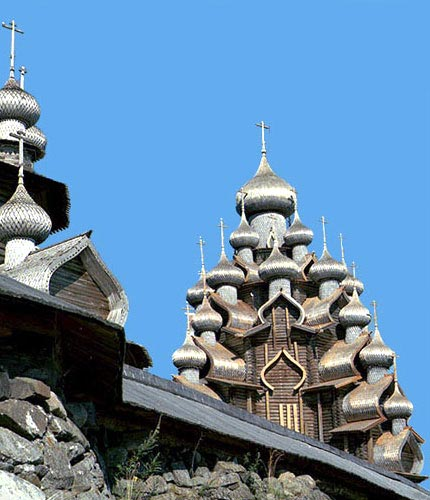 Двадцать два купола имеет Преображенская церковь. Разметали в стороны свои крылья стрельчатые «бочки» — словно кокошники русских красавиц. А на гребнях — стройные барабаны и луковичные главы с крестами, покрытые чешуей серебристого лемеха. В северные белые ночи светятся они загадочным фосфорическим блеском, в сумрачный день они кажутся тускло-серебряными, в погожий — голубеют. Иногда они ярко белеют, будто полированный алюминий, порой тусклые и свинцовые, или замшелые и зеленые, или бурые, как земля... Но поразительней всего они меняются, когда солнце садится за дальние острова: тогда купола медленно разгораются под холодно зеленеющим небом, наливаются жаром и долго не остывают. Один ярус, другой, третий, четвертый... Все выше, выше, и вот уже в самое небо врезалась верхняя глава, венчающая всю эту грандиозную пирамиду.