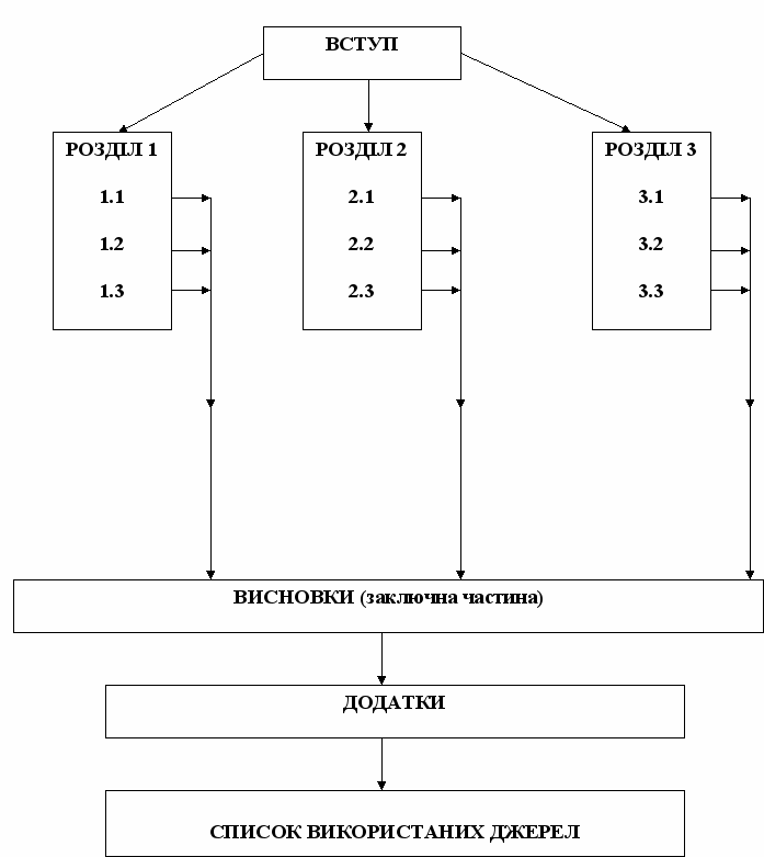 Курсова робота повинна мати чітку й логічну структуру (рис. 5.1): вступ (2 - 3 стор.), основна частина – 3 розділи (20 - 25 стор.) та висновки (2 - 3 стор.).
